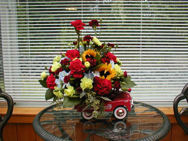 Ain’t these purty? The fire department sent these to me as thanks for supporting Bill through his years of service. Of course, Bill says the flowers are mine, but he gets to keep the little fire truck! Thursday will be his last day and it’s been a little emotional at times. Since he’s on days and won’t spend another night at the fire station, he cleaned out his locker last week. Twenty years worth of stuff was spread out over our living room floor as he went through it.