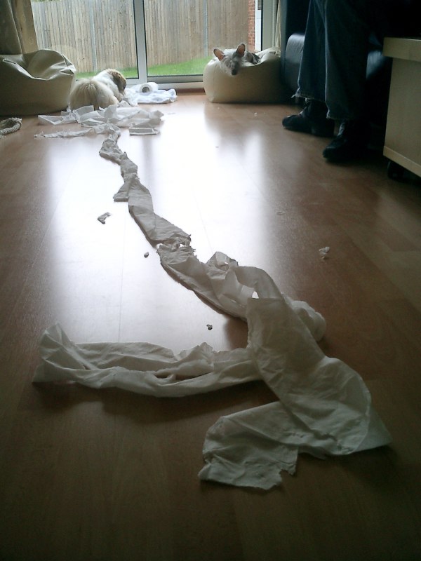The little one up to his eyeballs in toilet paper is Pistage while Blue looks on from his beanbag saying, “Who, me? I’m innocent!” These little darlings belong to my son and daughter-in-law.