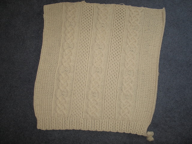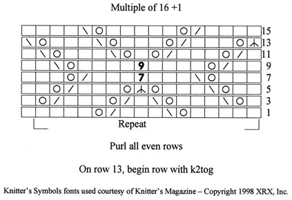 Take a look at the price. Yes, that’s right! I paid $1.48 for this book – eons ago and who knows where. The problem is that the patterns are not charted, they are written out. Well, I’m a charting kind of knitter. I just refuse to do lace or Aran patterns that are not charted. In fact, I have a pattern for a beautiful Celtic cardigan that I would love to have, but have been putting off because it is not charted. However, I downloaded the Knitter’s Fonts and decided to give it a go. Here is the result: