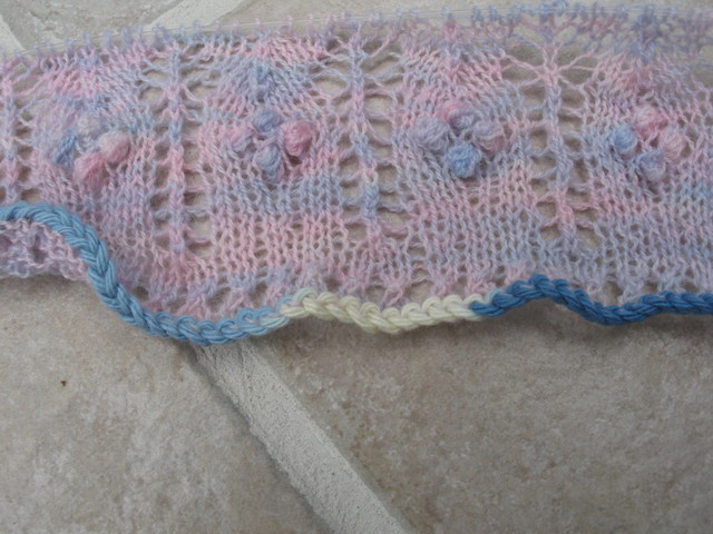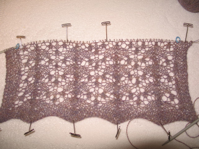 Ah – the sweet smell of success. After last week’s negative knitting fiasco, I have actually made progress. I decided I was not satisfied with the purple lace scarf – just too much air and not enough yarn for me. So I tried this: