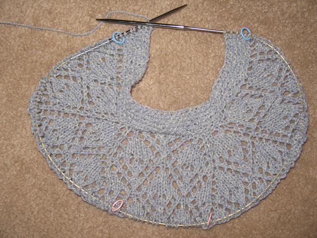 I’ve actually made a lot more progress, but now it’s starting to bunch up on the needle so you can’t see the pattern as much. When I started, I thought, ‘Wow, this is going to go really fast!” Of course, I forgot that my repeats are increasing exponentially and it’s really slowing down! But it’s a pleasant knit and I love the Silky Wool. It’s going to be such a nice shawl to wear. I can see myself throwing it on, even over a pair of jeans, for a quick run to the store on a cool fall evening.