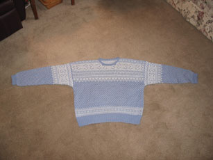 I going to choose two. One is my Starmore Flying Geese gansey (out of Dale Baby Ull, of course) and my Norwegian sweater. This Norwegian sweater was knit without a pattern, using Elizabeth Zimmerman’s guidelines. I used fingering weight Alpaca! It was a rousing success and gave me an enormous confidence in my abilitiy to improvise and it is a wonderful, wonderful sweater to wear. It was also the first sweater I ever steeked and cut – on fingering weight alpaca. EZ said it was ok.