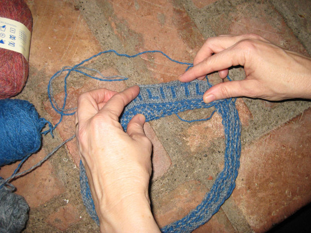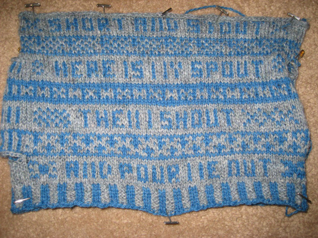 I still have to embroider the slanted lines on the N’s and M’s. I have mixed feelings about this project. As I mentioned, I could not get a gauge of 7 stitches per inch on size 0 needles! I must be super loose when doing color patterning. There was no question of going down another needle size. It’s certainly acceptable, but larger than it’s supposed to be, which, I think, lessens the "cuteness" factor. And, I am running out of yarn. I’m thinking about emailing Two Swans to see if I can exchange the other two skeins I got for another cosy. I don’t think I’m going to attempt another one any time soon. This was my first time doing corrugated ribbing. I like the effect, but it sure is rough on the hands.