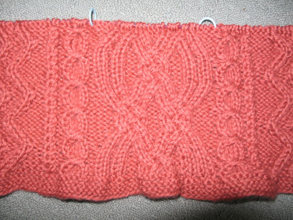 This did free me up to start something new. Marguerite and I had decided to start a KAL on Labor Day. With her blessing, I started a few days early – she will zip past me in no time flat! We are working on the Set-In Sleeve Aran from Janet Szabo's book, Aran Sweater Design. Marguerite has dubbed this "Chenille" because it looks like a design from a chenille bedspread. My version is being made from Elann's Peruvian Highland Wool in a deep rose: