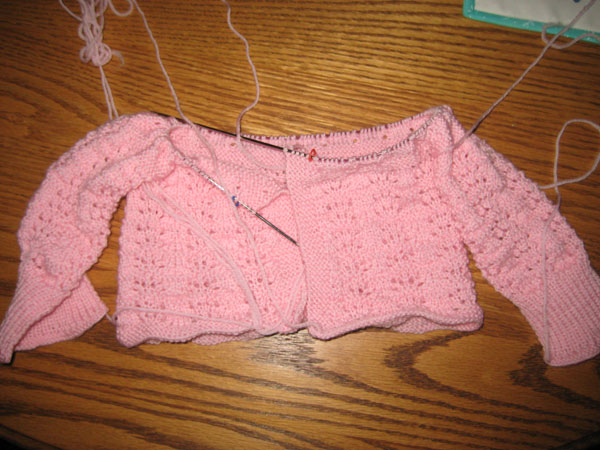 Despite my best efforts, the little pink cardi just wasn't doing it for me. When I got to the yoke, the shape took a decidedly alarming turn and didn't look as if it would fit any baby I knew. So it has been frogged: