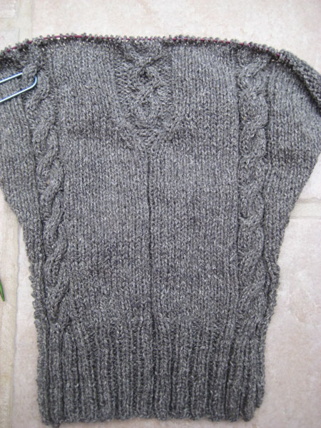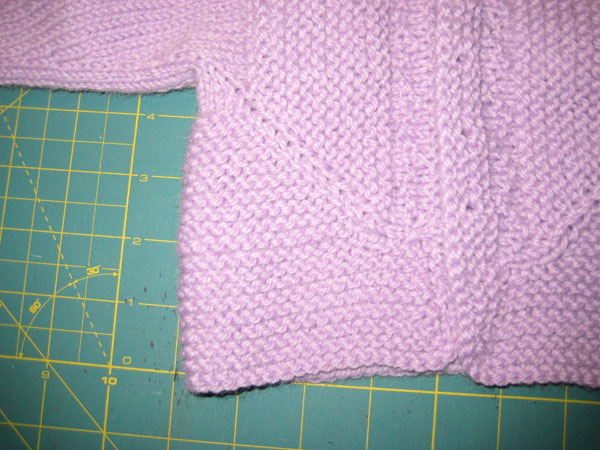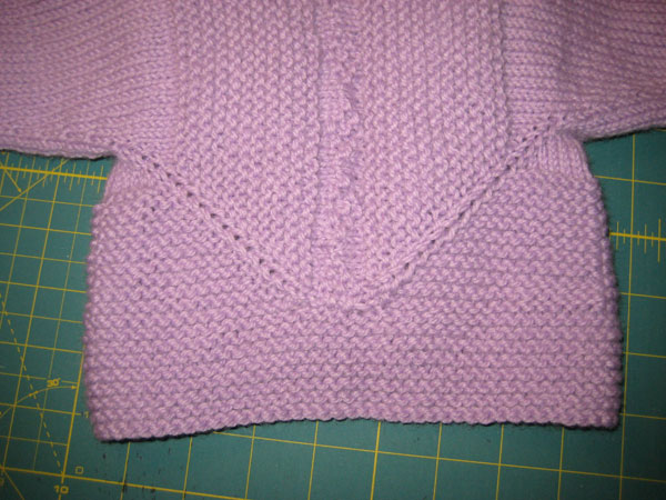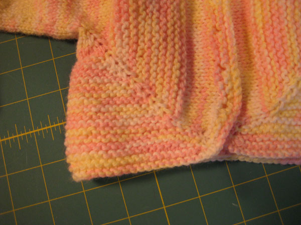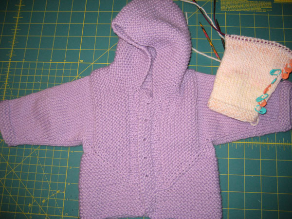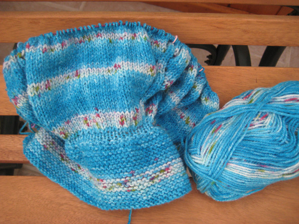 This is King Cole "Splash". Although I usually avoid 100% acrylic, I loved the colors in this so much and it's very soft and not at all "squeaky". This will be Ivy's Christmas sweater – a simple cardigan from "Top Down for Toddlers". In the picture, it is actually upside down – the garter stitch area is the collar. This is DK weight and I'm finding it a rest for my fingers from the worsted.