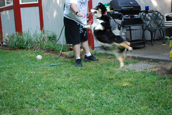 It's a Nikon D60. I haven't even gotten beyond automatic and I can't believe the quality of photos that it takes. I tried getting action shots of Maggie chasing bubbles, but she's too quick: