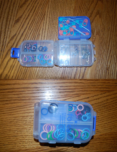 I also got a goody in the mail this week. Lorette had blogged about a neat little container for stitch markers and what-not. I love little containers almost as much as I love tote bags and ordered one immediately. How cute:
