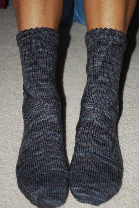 These will be Abby's birthday socks – she chose Coriolis. I think it's a good choice – she wanted something fairly plain, but I wanted something interesting to knit. Oh, and don't freak out Abby – the yarn really is grey – it's Dream in Color Smooshy.