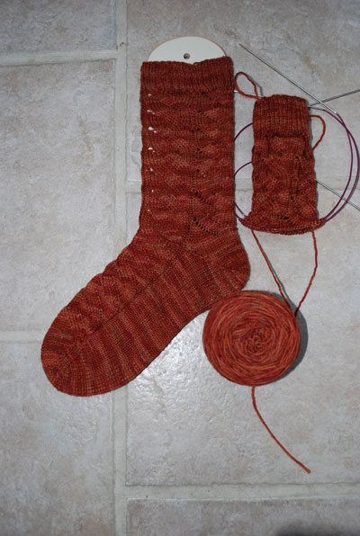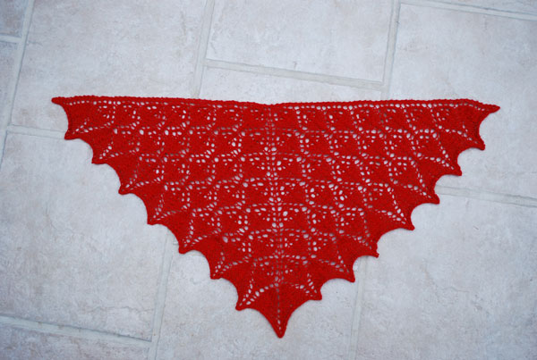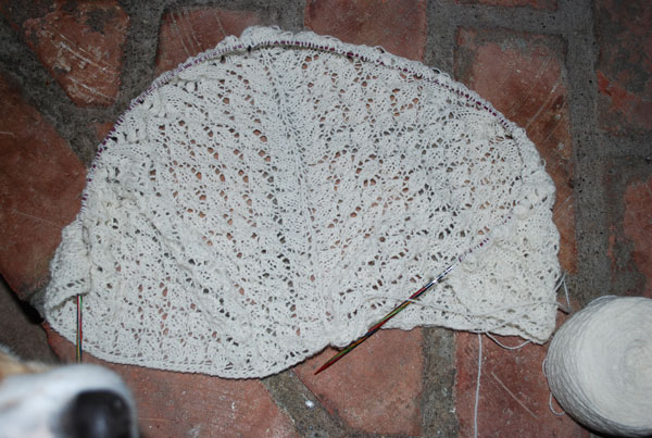 The Nutkins were given to my sister for Christmas and the scarf to my best friend. I also finished Sue's Swallowtail Shawl, but it still needs blocking. This now leaves me with only two projects on the needle, the Reversing Tide scarf and the Creideamh Shawl. The shawl is getting very close to being done. See?
