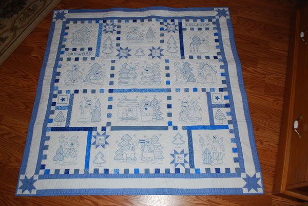 It does actually lay flat without rippling, but I was trying to get a quick picture before a certain puppy could make herself comfortable right on top of the quilt. This was a machine embroidered piece and was great fun to make. I was able to find all the blues in my stash, with the exception of the long border strips and binding.
