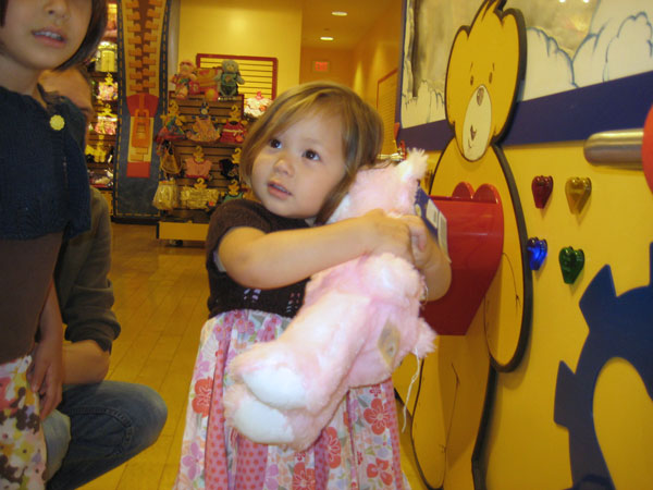 Since we'll be gone for Mei-Mei's birthday, we joined the family at Alderwood Mall Sunday for a little party at Build-a-Bear. Despite Abby trying to distract Mei-Mei with other bears, she insisted on a pink bear. She is definitely a girly-girl. But how could you deny this kind of love?