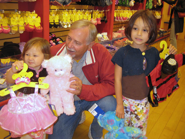 When it came time to select outfits, pink won out again and the pink bear was outfitted in a pink ballerina costume. Isobel made big points with her grandpa by picking out a firefighter costume so her bear would look like Yeh-Yeh (grandfather).