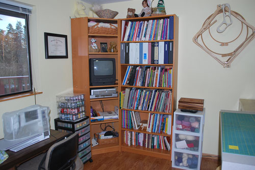 As you can see, I have my little nest with coffee cup, thread, scissors and remote controls handy. My ancient little TV bit the dust during the transition, so yesterday I got a new small flat screen so I can watch my cheesy disaster movies while I quilt. Truly my little bit of heaven on earth.