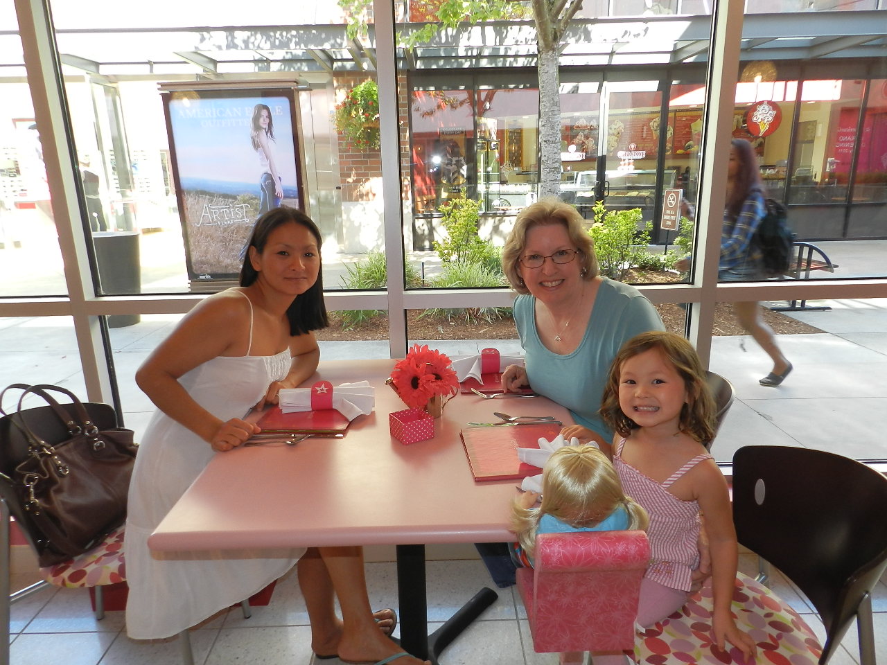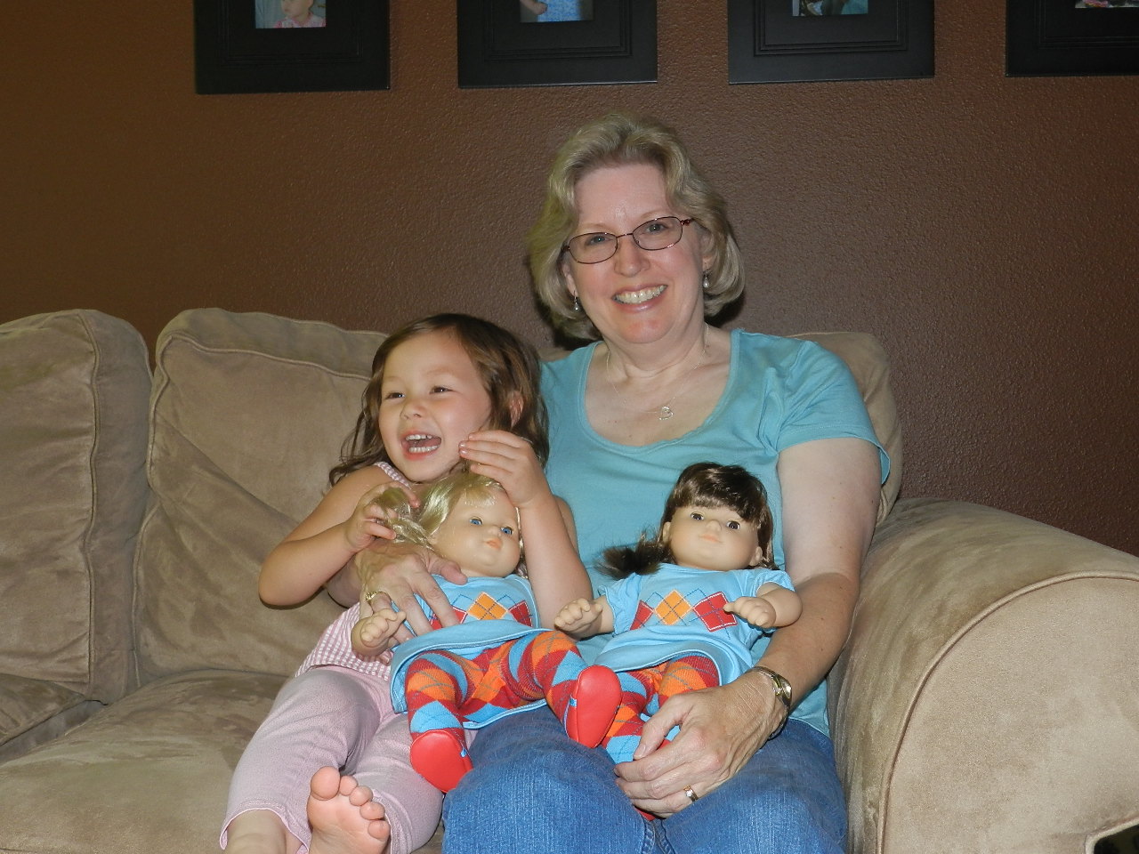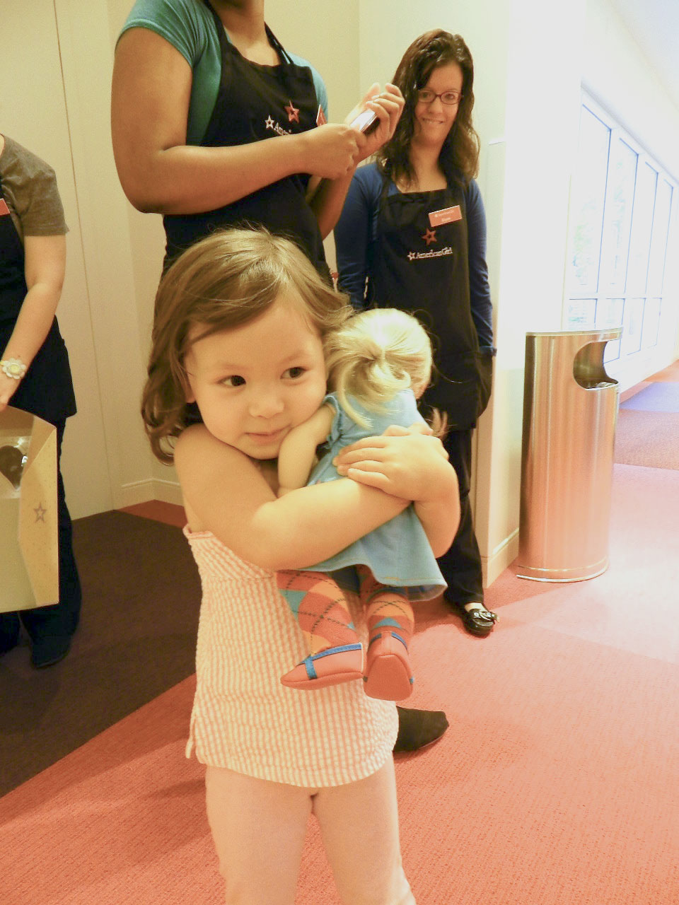 The cuteness quotient has been pretty high around here lately. First off, I've been sewing doll clothes and it doesn't get much cuter than that. I made p.j.'s for Mei-Mei's doll and she had to try them on immediately: