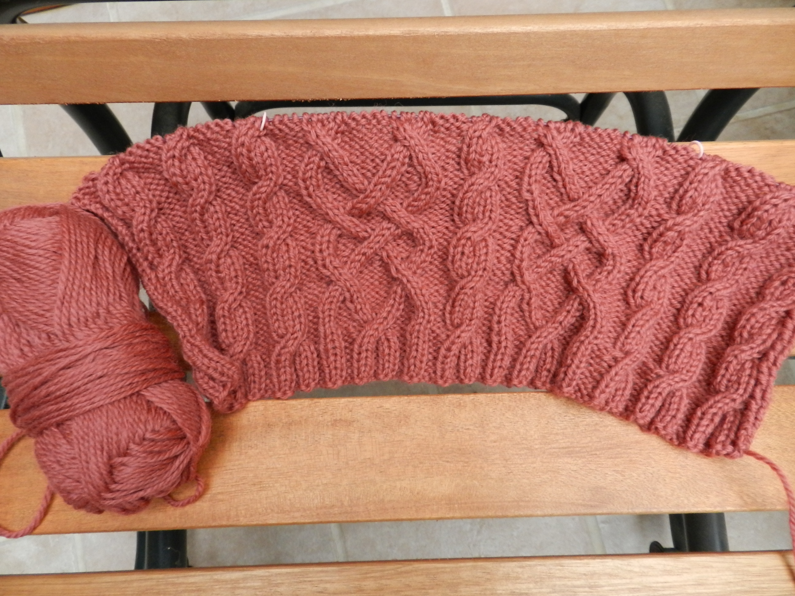 Yes, that sound you hear is the sound of frogging. I have never been afraid to cut my losses, so yesterday the Kerry Cardigan went to that great lily pad in the sky. This, despite the fact that I had both sleeves done and was halfway up to the armholes! However, I was hating every minute of working on it. According to the pattern, the back and two fronts are knit together up to the armholes and then split. With worsted weight wool, this was making a heavy weight on my needles that was hurting my hands and making me frustrated. I could have just frogged that and knit them in pieces, but I just could not face doing that honeycomb pattern again and it was curling badly anyway. In her recent posts, the Yarn Harlot showcased Gwendolyn. I really liked the pattern, especially the sleeve detail, so it is currently on my needles: