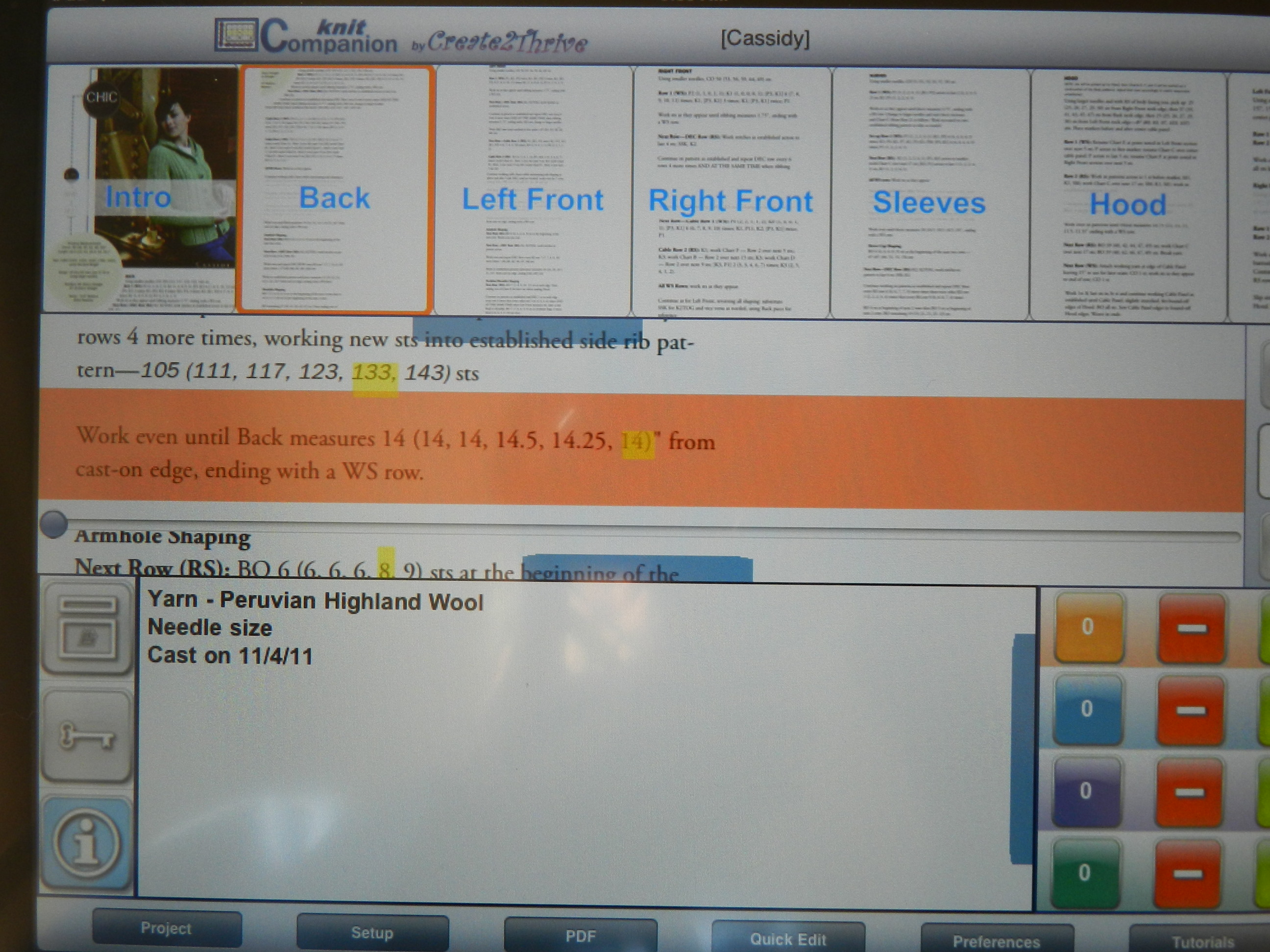 For each page you can clip out the pertinent instructions – no more searching through multiple pages for the ones you need. I can highlight exactly where I am in the appropriate page and can also highlight my size. I can make notes as I go along for any changes that I might make. The little blue bars allow you to collapse those panes out of the way. Notice there are mutliple row counters on the right – those also can be collapsed out of the way.
