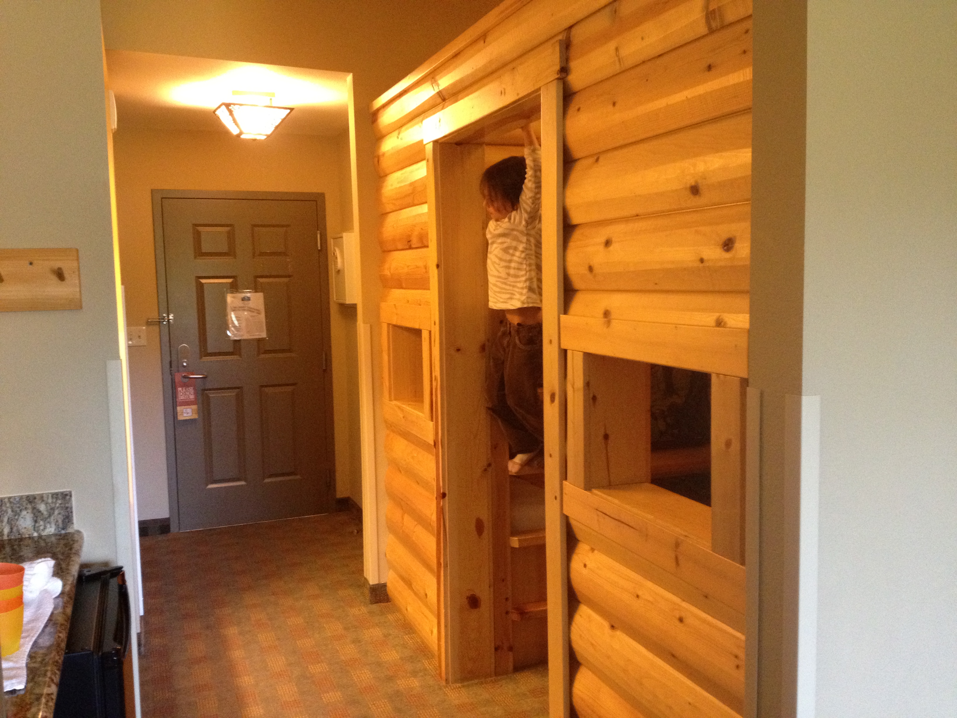 I did have a wee bit of excitement lately when Abby and I took the girls to Great Wolf Lodge. This is a nice family-oriented hotel just south of Olympia with an attached indoor water park. None of the guys seemed all that interested in going, so we decided to make it a girls' mini-vacation. When we got there, we were able to upgrade to a Kids' Cabin room, so the girls had their own little cabin with bunk beds in the room: