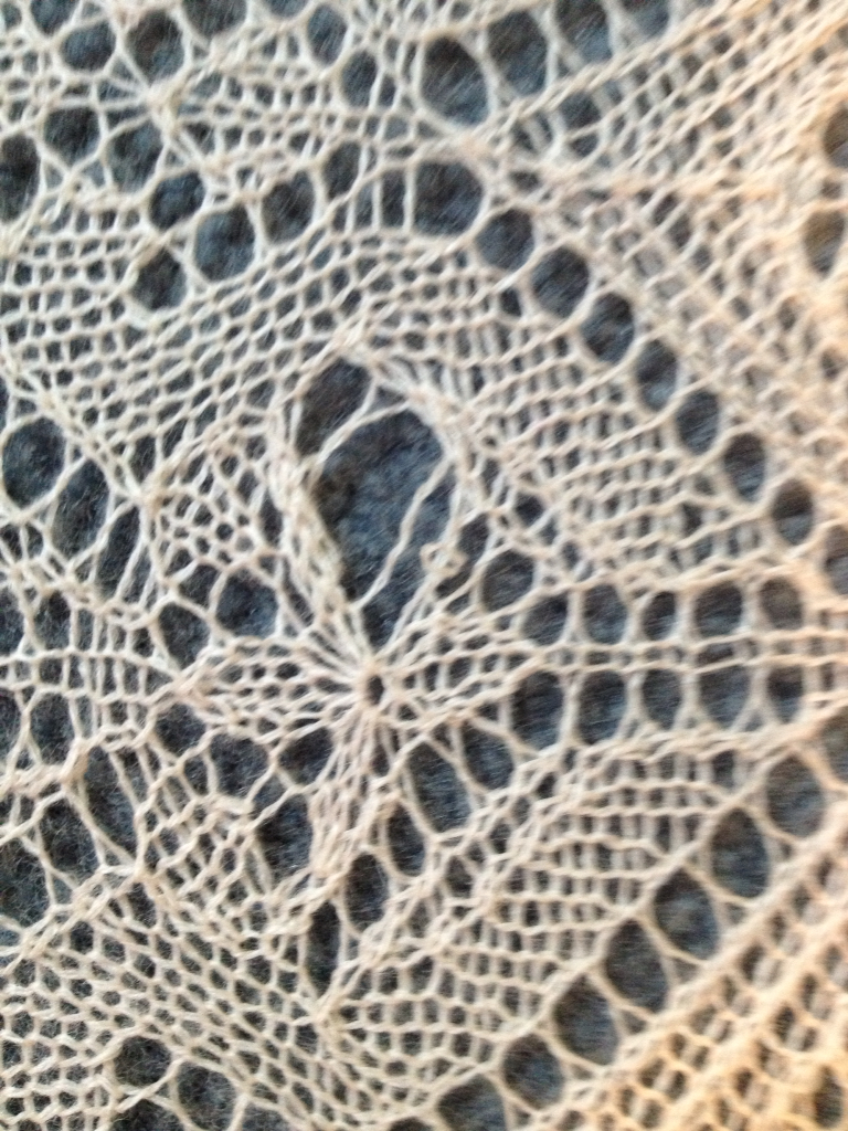 When blocking Evenstar, I encountered every lace knitter’s worst nightmare – a dropped stitch! Actually, it could have been worse. It could have been a broken stitch with the resultant loose ends. This stitch had only dropped down a few rows and was waiting patiently to be picked up.