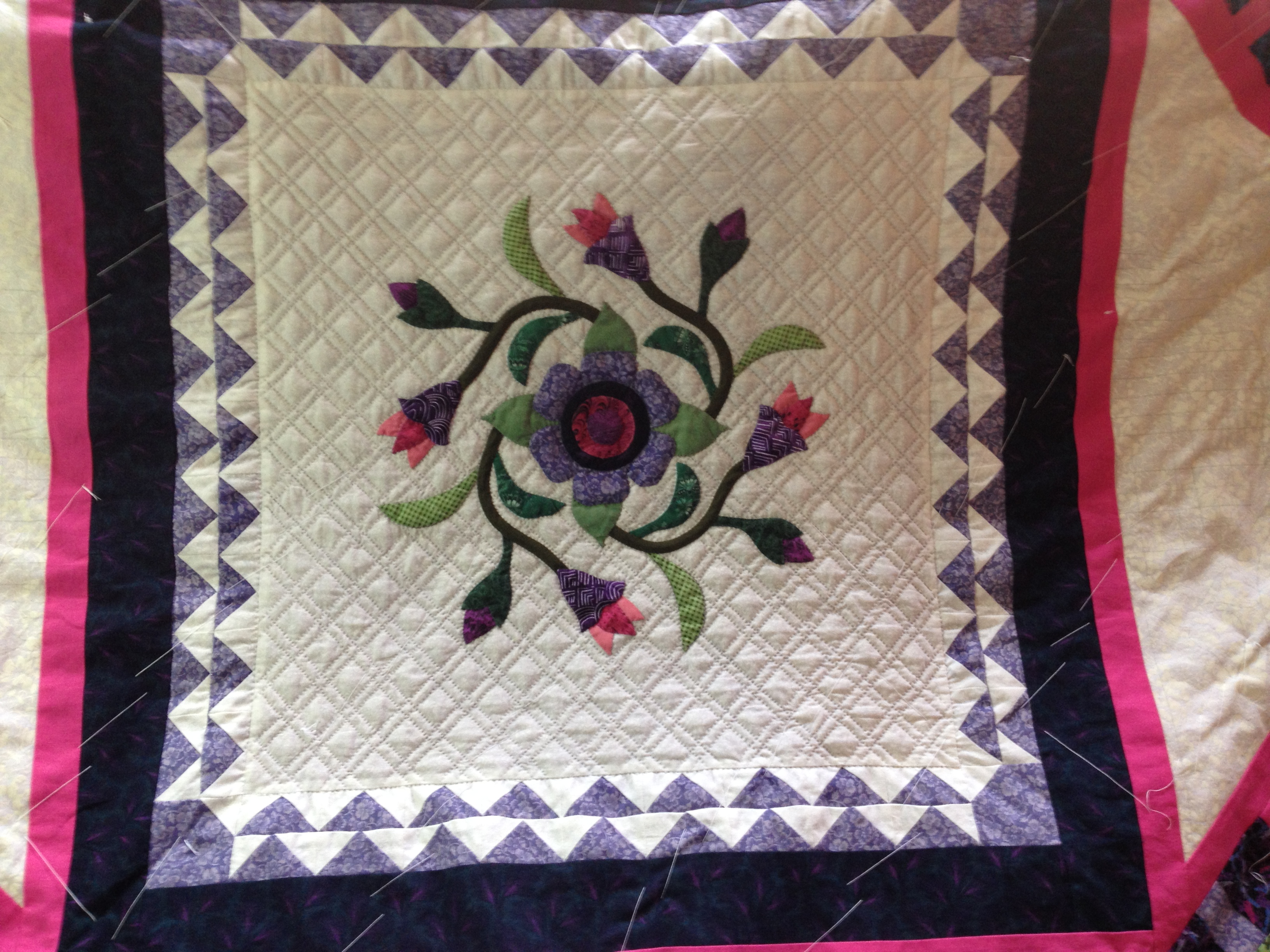 I have finished the center panel and now have a few boring evenings to spend just quilting in the ditch to get to the more fun setting triangles.