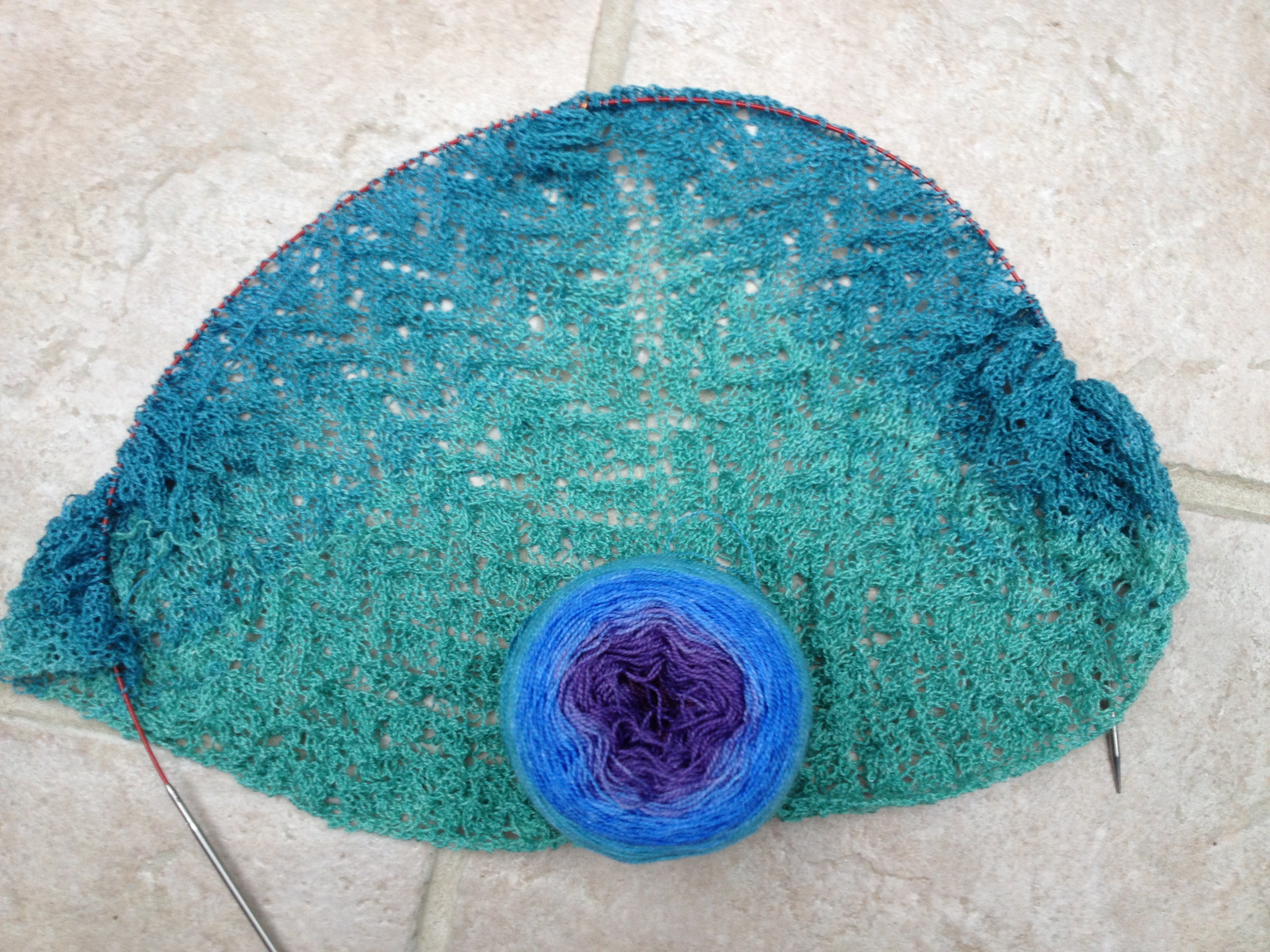 In knitting news, I completed the surgery on the belly button cast on for White Snows of Winter. I'm happy to say that the surgery was successful, but sad to say that the patient expired. It was pretty obvious that this was not the right pattern for this yarn. I quickly cast on for Elizabeth by Dee O'Keefe. I have really fallen in love with her designs. They are clean and crisp and very logical to knit. Patterns are error free and there's a delightful group on Ravelry. I like her designs so much that I have knit the Wilshire Shawl not once, but twice. Progress has been fast on this and I am on #7 of 8 charts. This photo was taken about 3 charts ago.