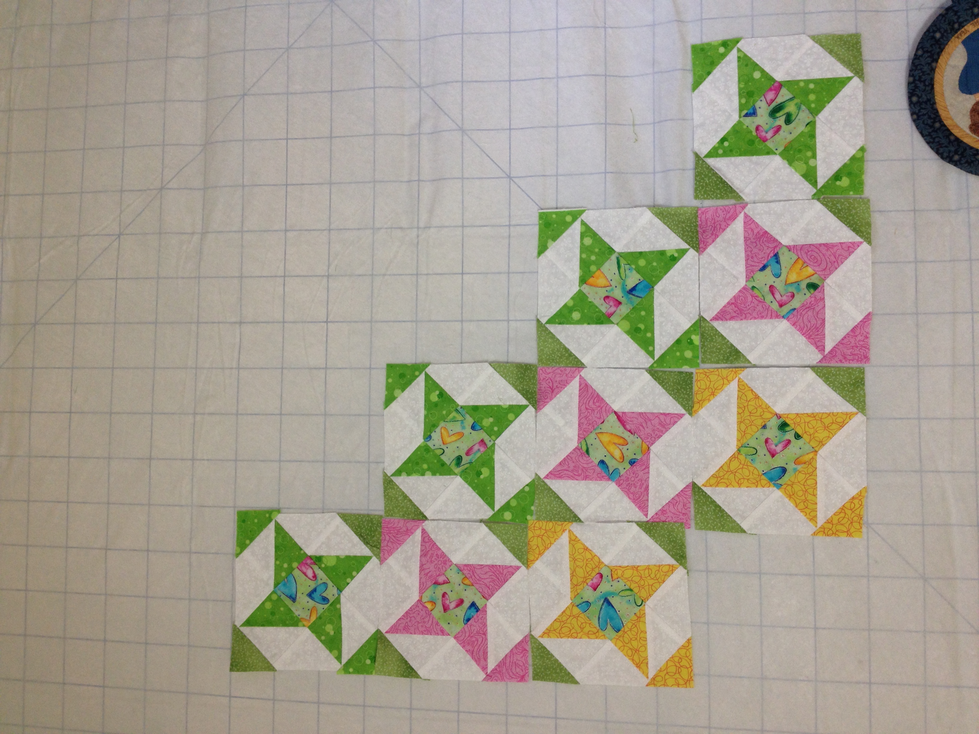 This book has designs that utilize her diagonal ruler. Let's say you want a square that is 2 inches, measured on the diagonal instead of the sides. You don't have to do the math – you just use the 2 inch mark on the ruler and it even adds the seam allowance for you. Easy peasy. This is the quilt I'm working on from the book: