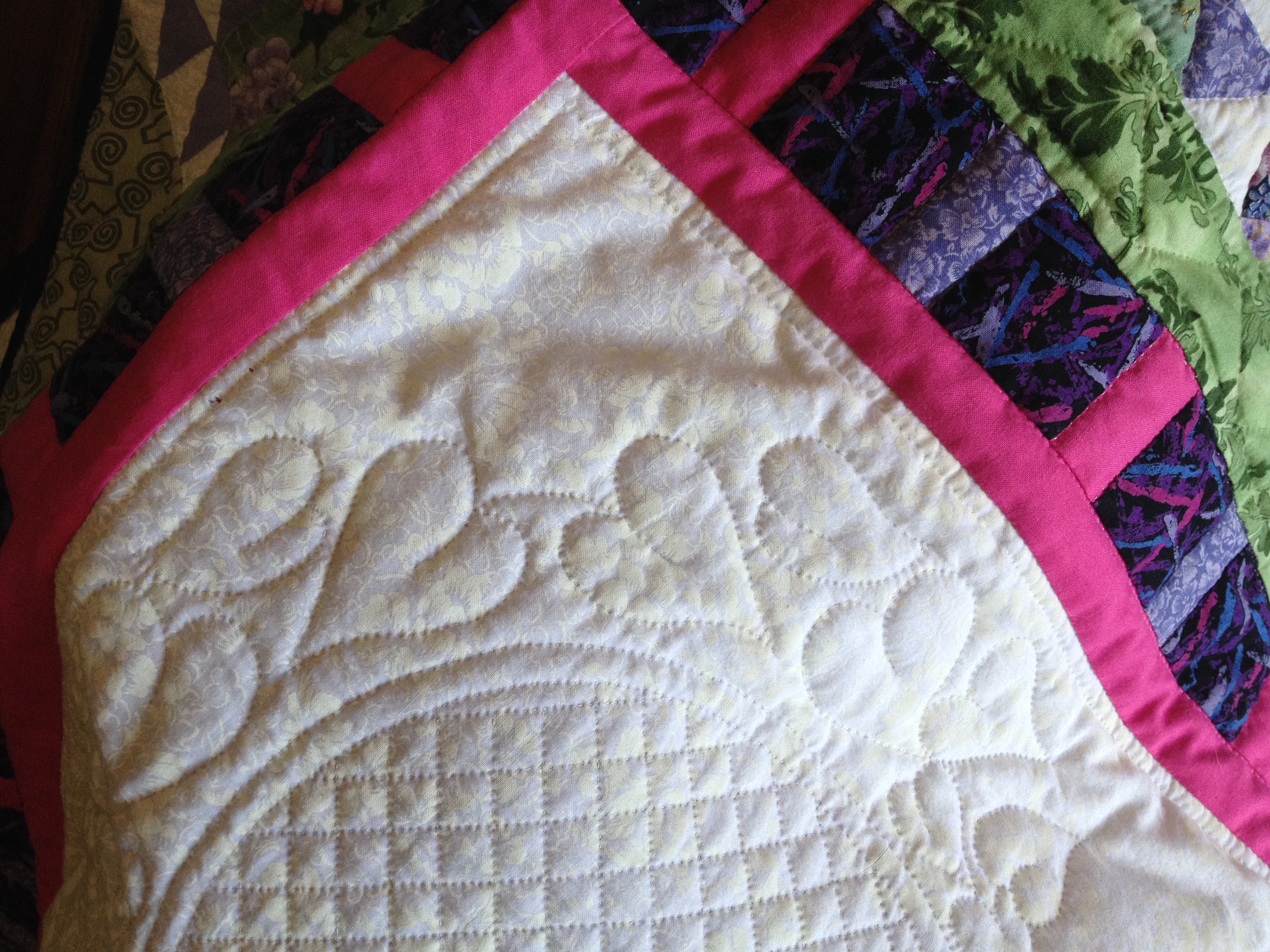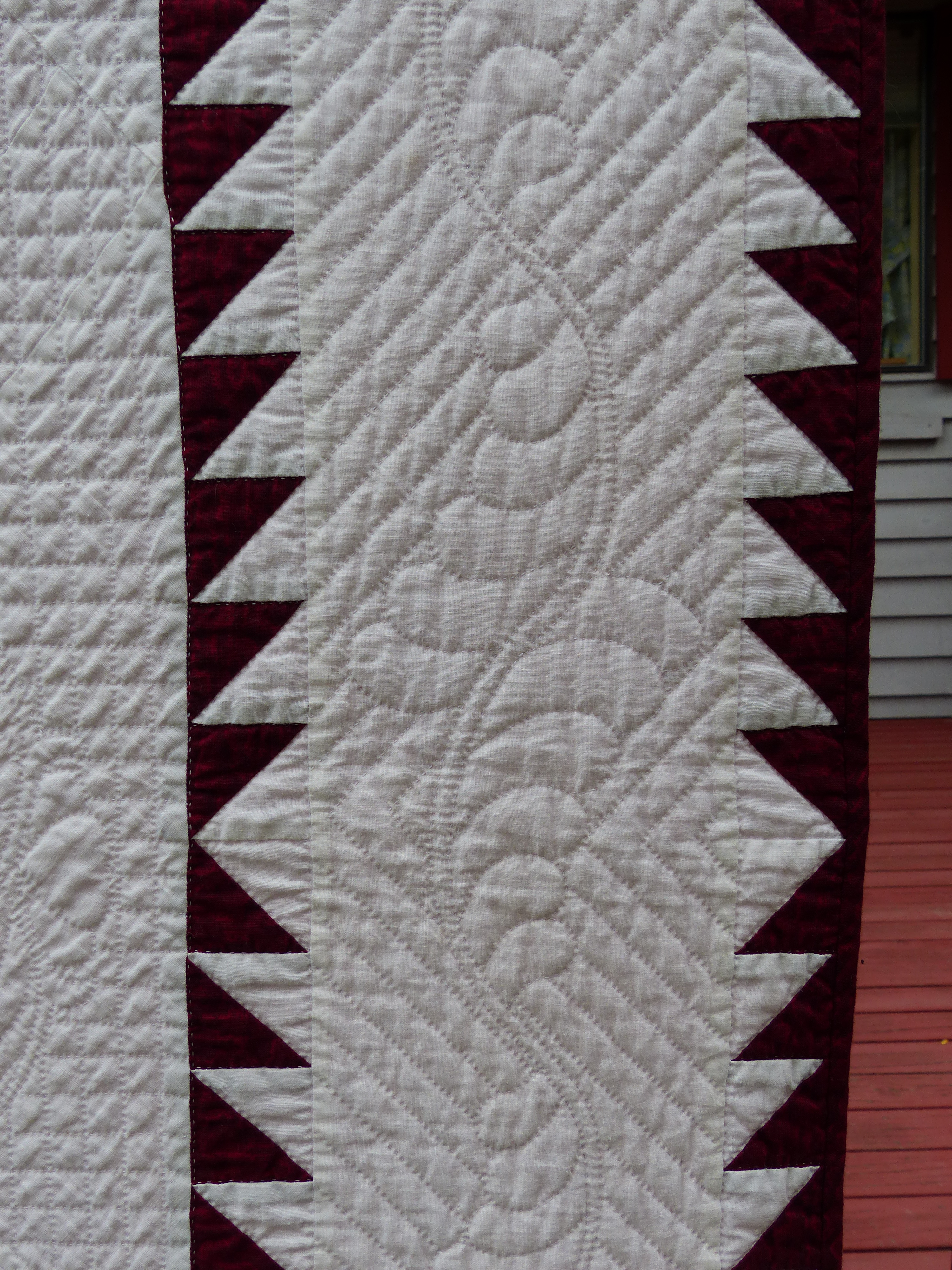 The good news is that I am on the last wide border and then all that is left are four smaller borders and some fill in quilting on the inside. The quilting I have on some parts doesn't quite fill up the space adequately and I need to add some more leaves or something.