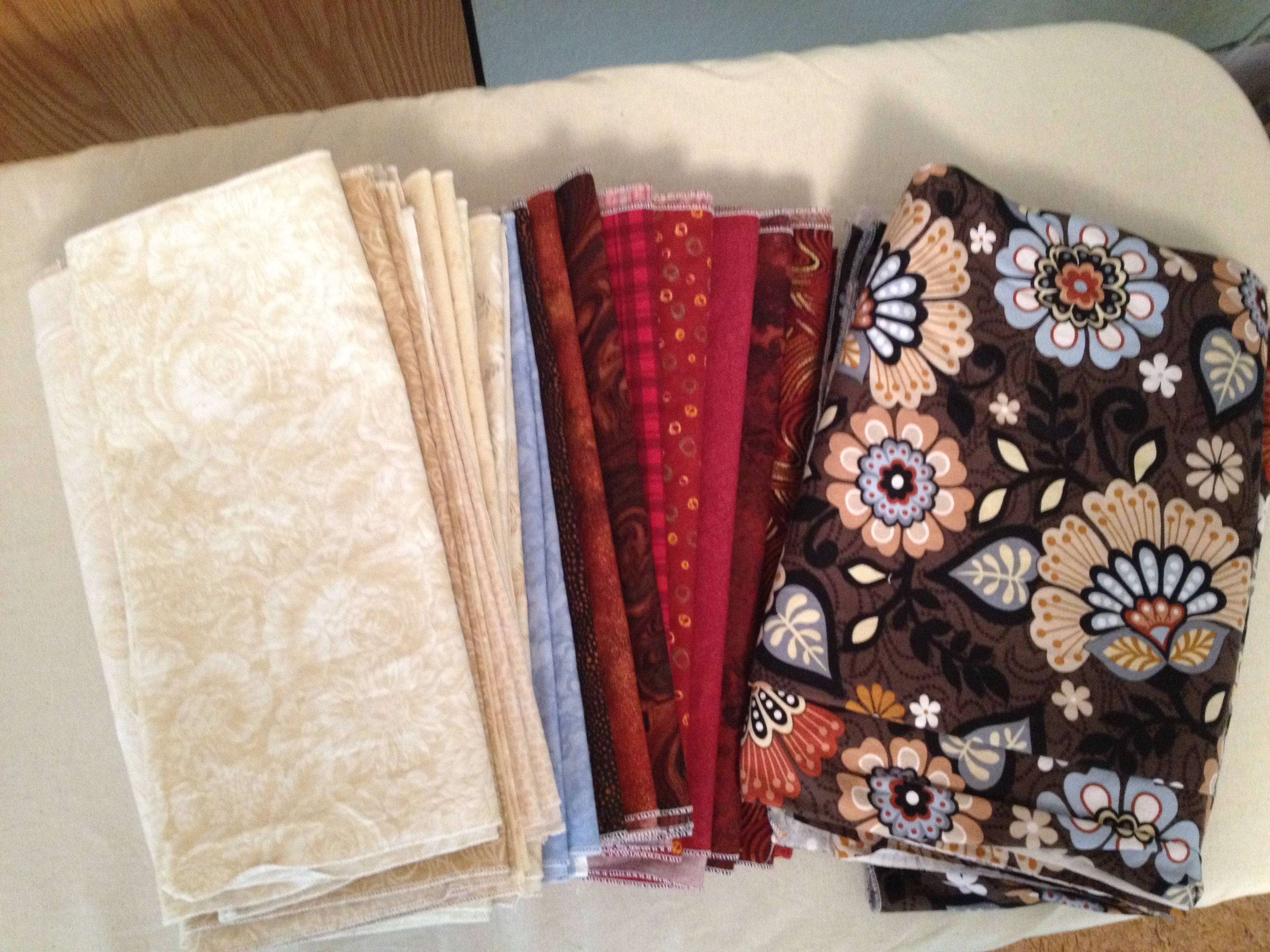 This is a little departure for me. I don't normally lean toward scrap quilts, although I like the look. But I just don't seem to be capable of being totally scrappy. For this quilt, I used Donna Lynn Thomas' guidelines for a more "planned" scrap quilt. I used the print as my idea fabric and Abby liked it well enough that it will also be the border. I'm especially pleased at all the beiges I found – I think this will add a lot of interest. The blocks will be Monkey Wrench, but I really haven't thought too much ahead on how to set them. Probably something fairly simple. The quilting will also have to be pretty simple, especially in the print border. I had thought to wait on this until October when I go to a quilting retreat. I thought it might be fun to have a new project to work on. But I doubt I will be able to wait that long!