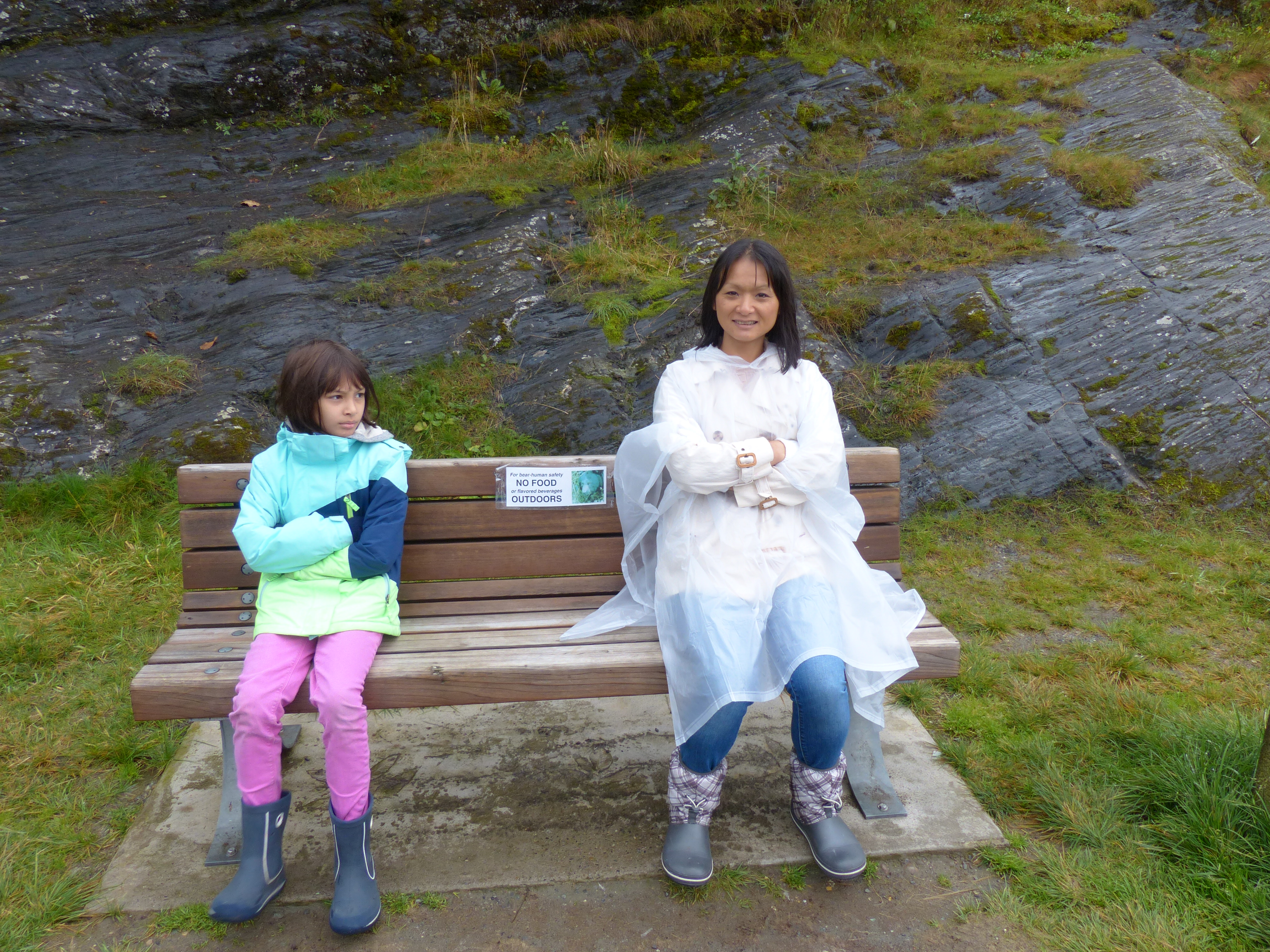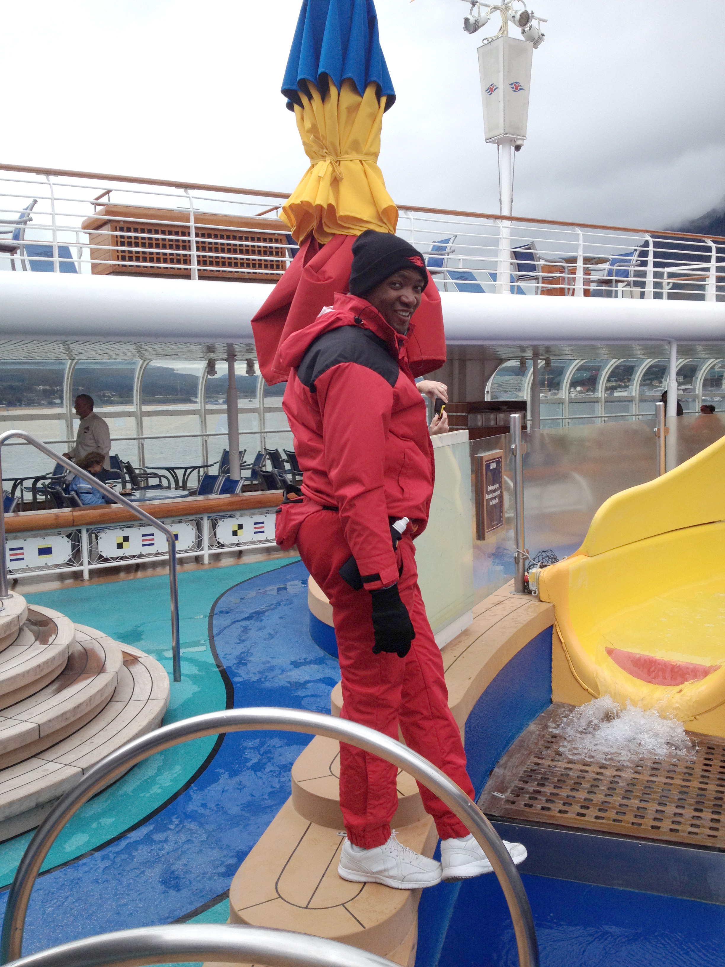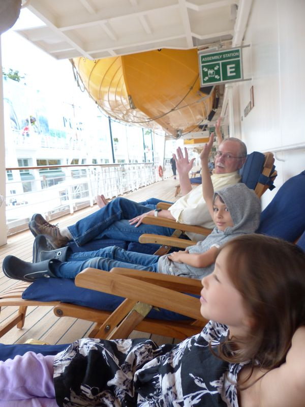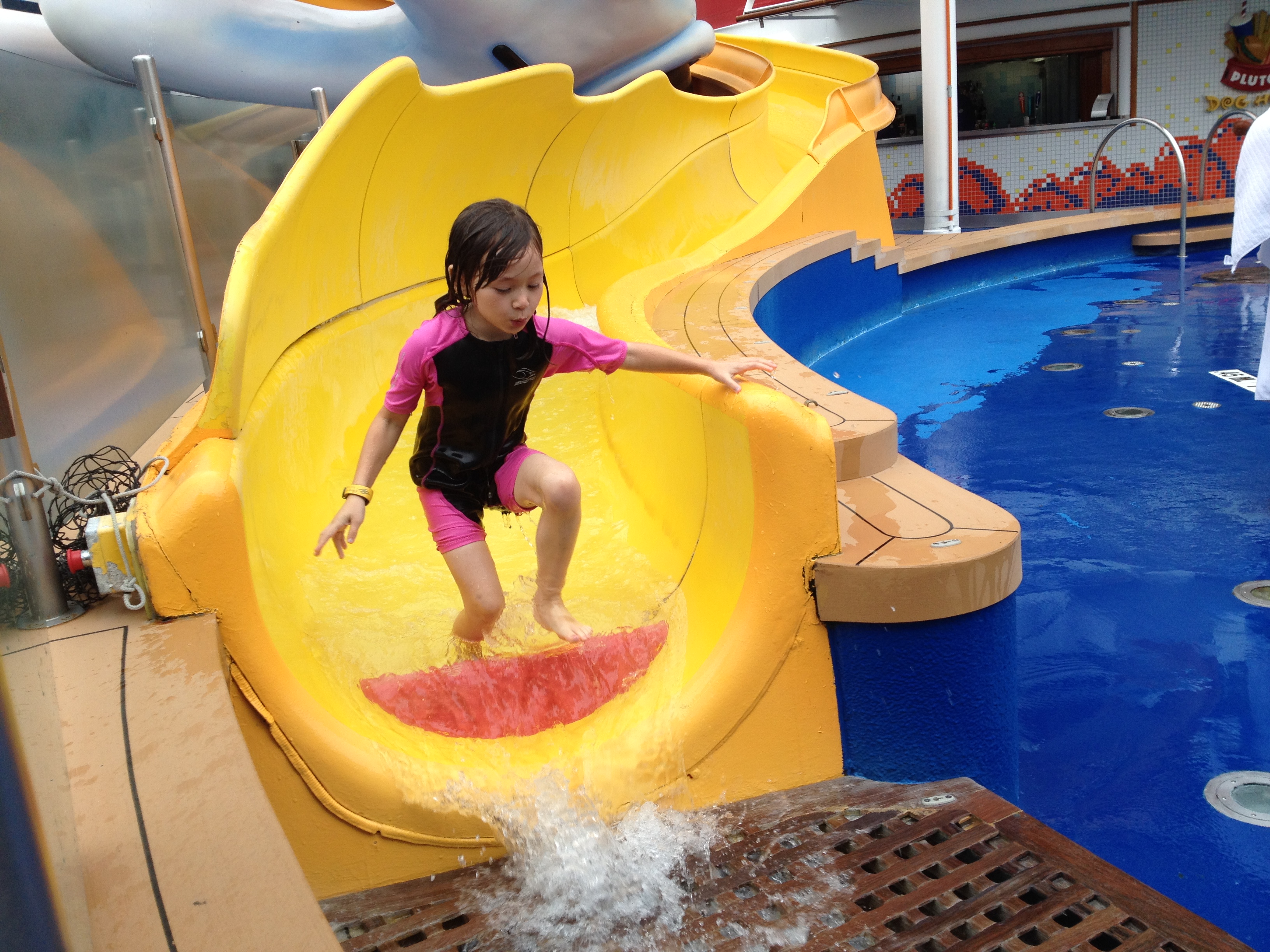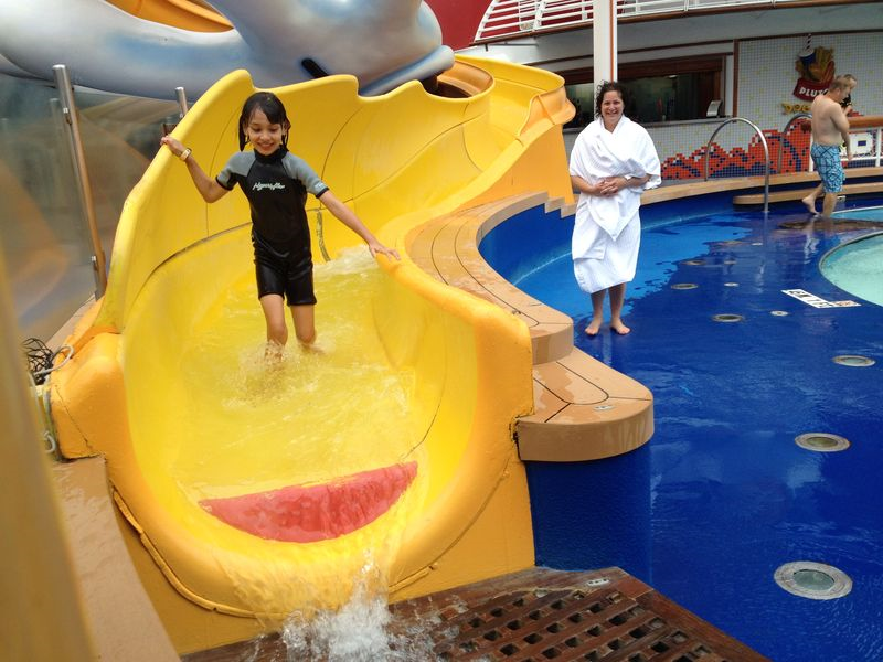 That sign on the bench warns people not to carry any open containers of food because of the bear danger. When we returned to the ship the girls wanted to dive into the pool and go down the slide. This is them: