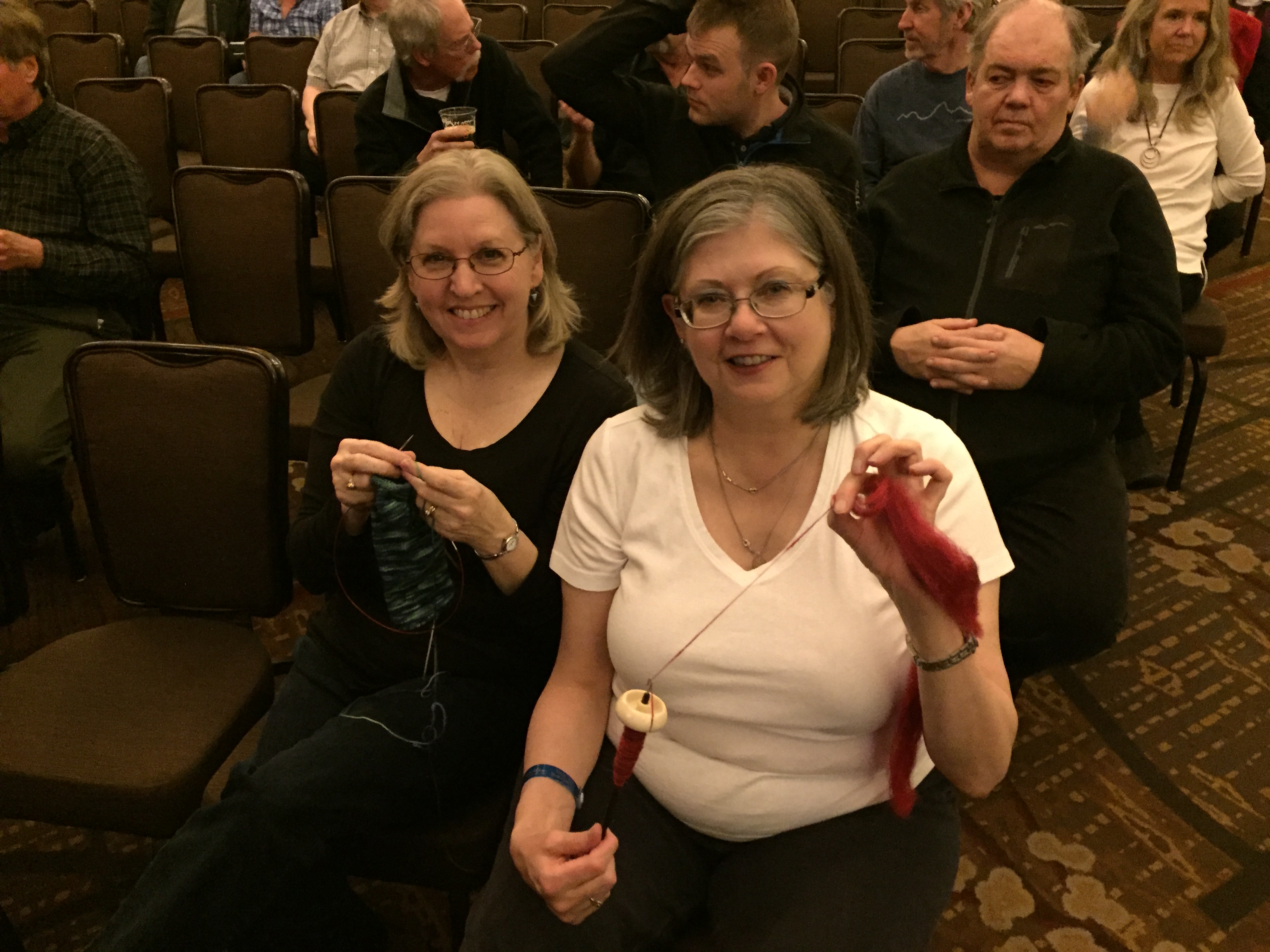 Some knitting was accomplished. Lorette even managed to spin during breaks in the sets. I'm amazed at her ability to drop spindle in a crowd – I would have had that thing rolling down the aisle!