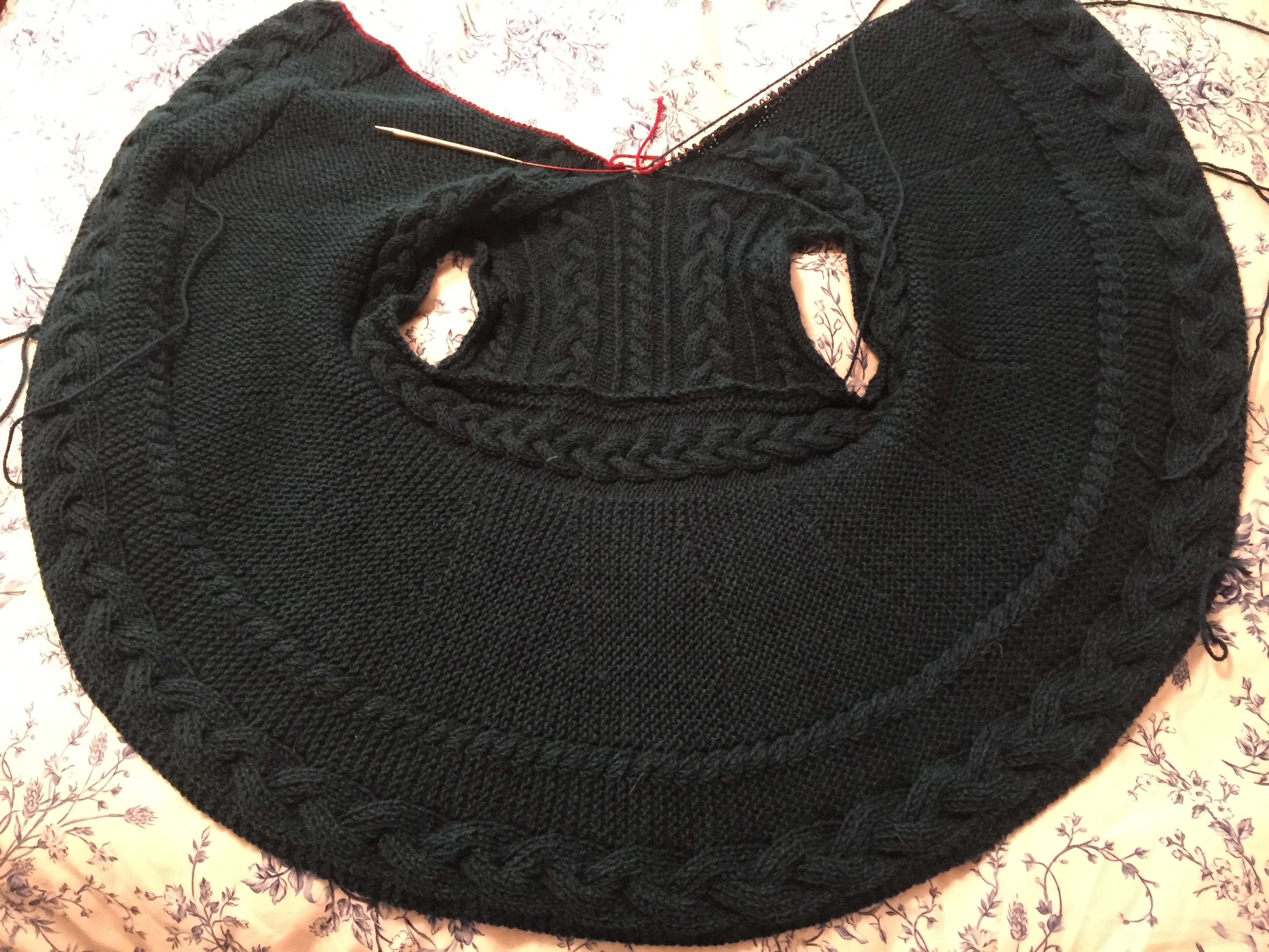 What an ingenious pattern! You basically knit a rectangular upper back section and the rest of the sweater is knit in a circle, attaching as you go. This picture was taken right before I joined the upper part to complete the circle. I tried it on Abby to see if it fit before I started the sleeves and it's perfect! The color in the picture is completely off – it's really a beautiful teal.